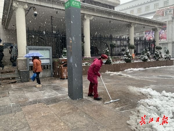 “凌晨1点起,我们就一直在关注雨雪,4点就把所有出入口的积雪清扫干净,铺了防滑麻袋。”记者跟着罗路到C出入口,她拿着一把除水铲,不停清扫路面雪水。她说,因为江汉路站的B、C出入口进出的乘客较多,所以特别安排专人对这2个出入口定时巡查。然后,她弯下腰把麻袋全部翻了个面,“由于还在下雪,我们每隔10分钟就要把出入口的麻袋翻一下,防止积雪。”