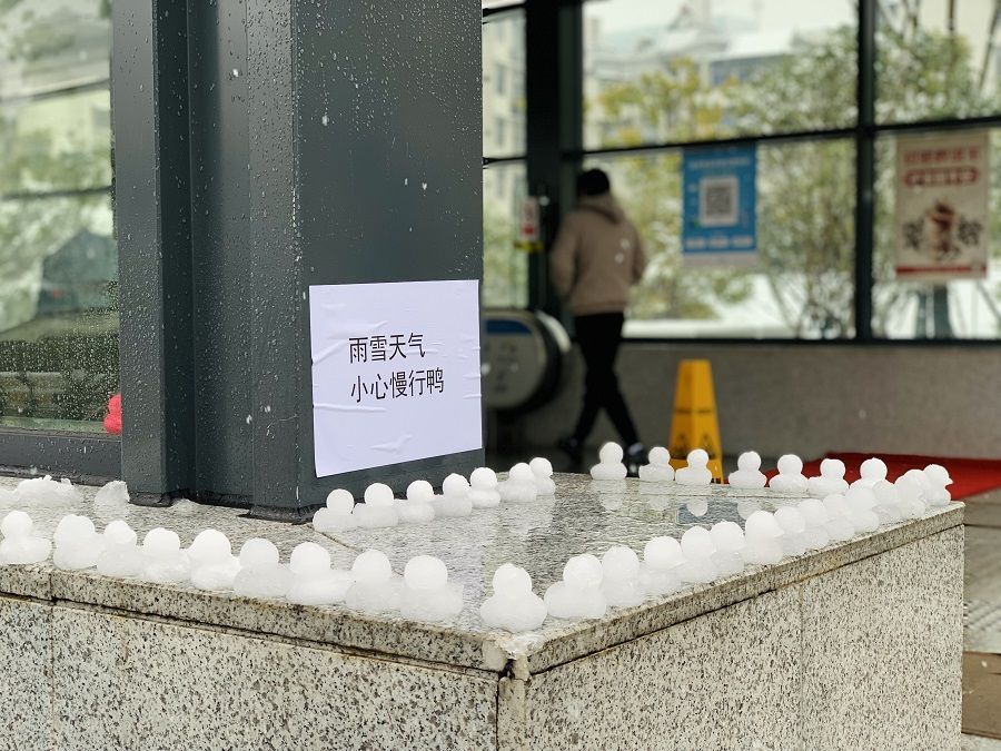 长江日报大武汉客户端2月7日讯 2月7日一早,武汉地铁8号线马房山站,工作人员清扫出入口积雪工作之余,还用模具捏了很多小鸭子摆在出入口,并贴上“雨雪天气,小心慢行鸭”提示,用谐音提醒乘客雨雪天气小心慢行。(长江日报记者陶常宁 通讯员孟凯 摄影报道)