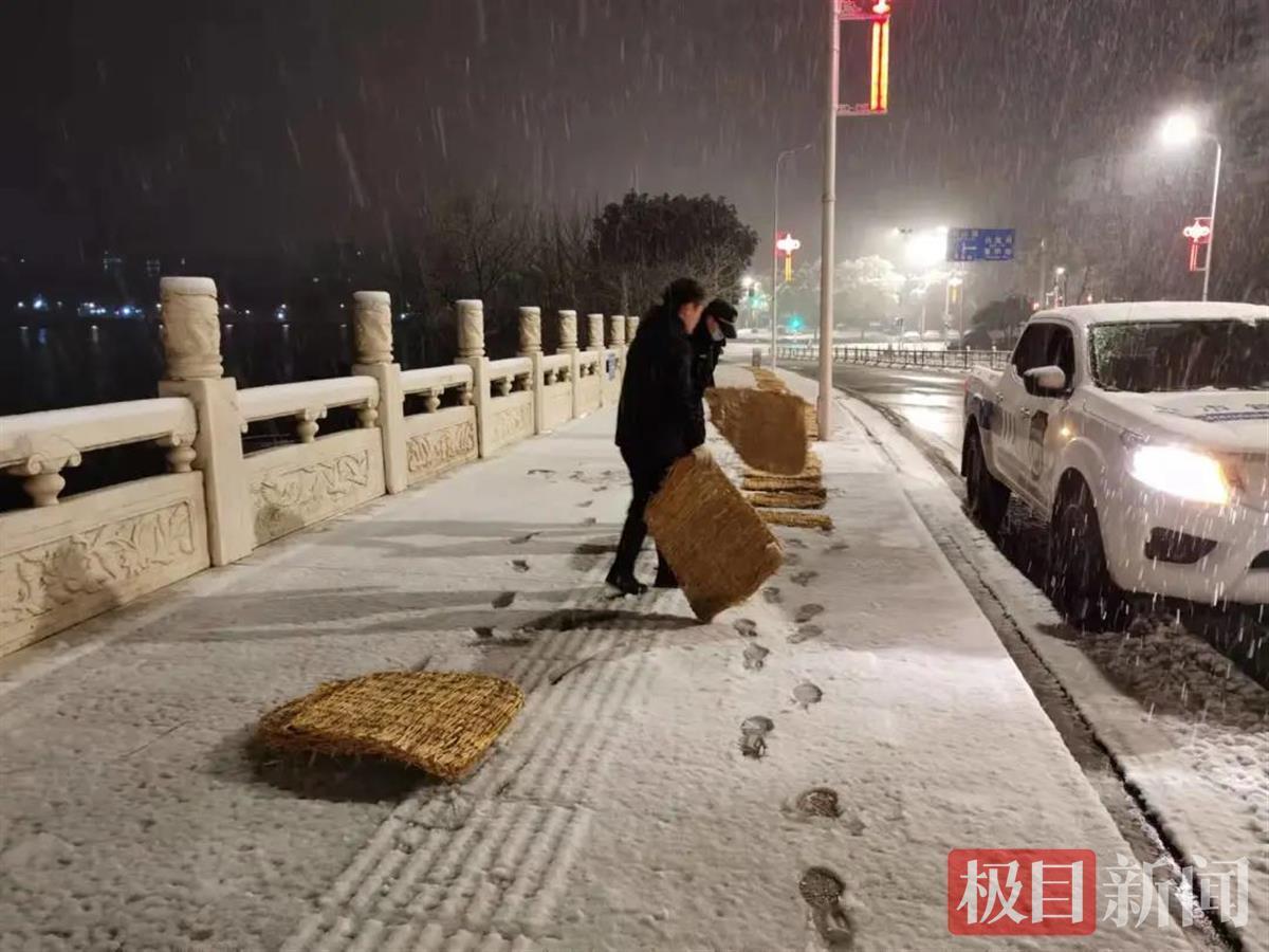 由水果湖街道公管办、综合执法中心、环卫所及武汉京环智慧清洁公司、深圳固防保安公司等组成的融雪防冻突击队,连夜出动140余人,专业车辆12部,在辖区易滑路段提前铺设草垫,加强黄鹂路、车家岭路等4个天桥,沙湖大桥、东湖路、梨园广场等6个地下通道及各风口路段的不间断巡查工作及路面铲雪,当天凌晨夜间共撒盐14吨、铺设草垫2800余条。
