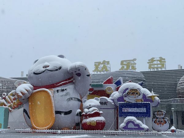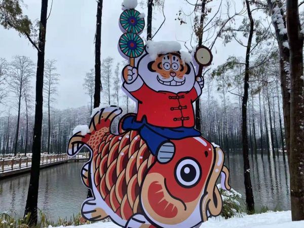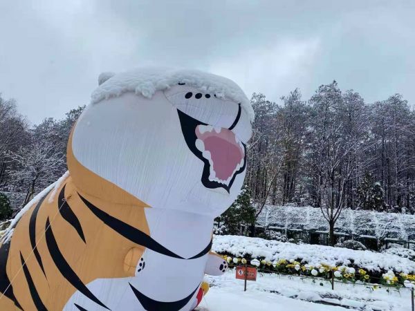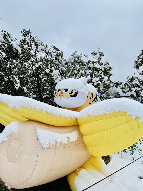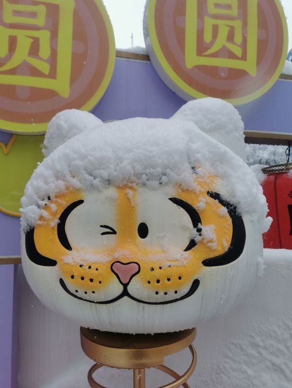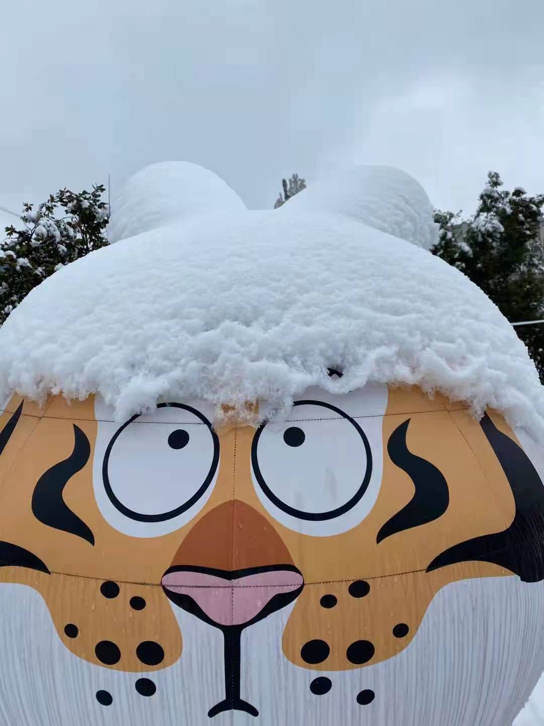 大雪一夜,武汉欢乐谷内的“胖虎”灯组头上积上白白的雪,憨态可掬,简直把人“萌化了”!