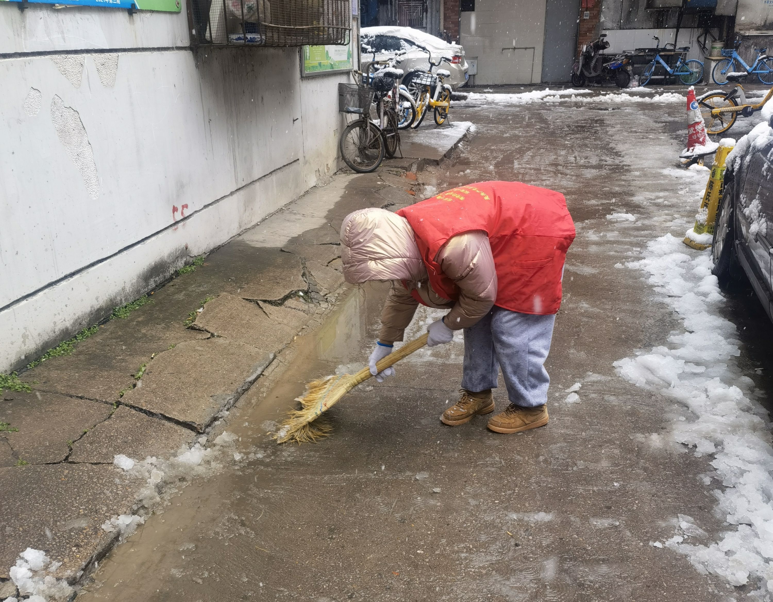 社区工作人员、志愿者带着铁锹、扫帚和盐,来到事先分配好的区域,有序开展清雪除雪工作。 通讯员韩莉 摄