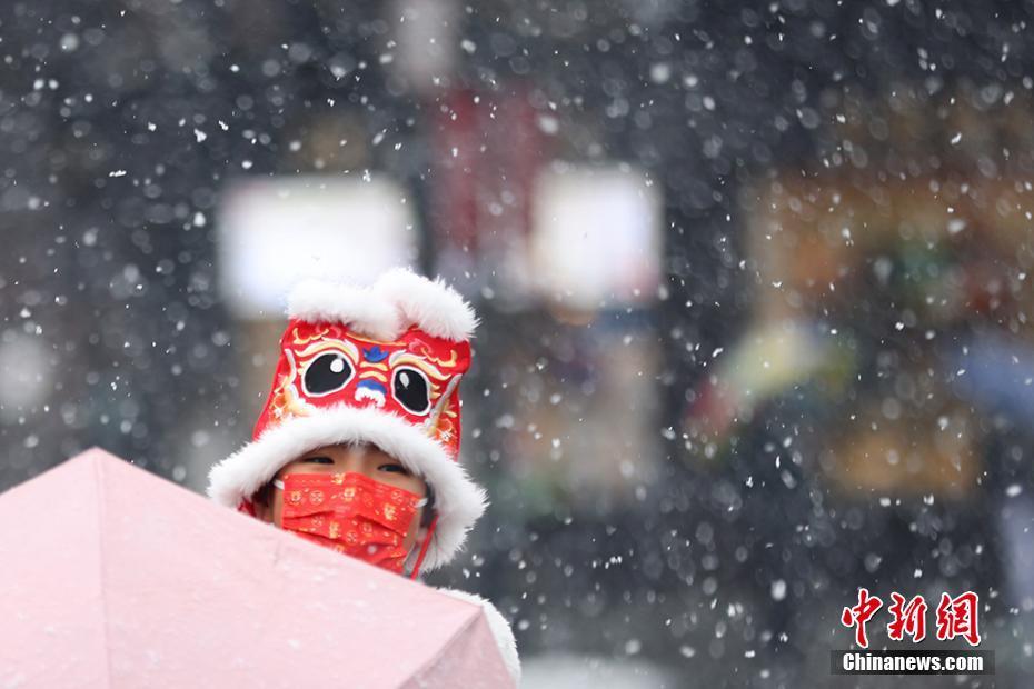 2月7日,南京城迎来漫天大雪,雪花纷纷扬扬。据中央气象台发布的暴雪预警信息预计,安徽东南部、江苏西南部、浙江西北部等地部分地区有大雪。图为可爱的少年戴着虎帽在街头经过。 泱波 摄