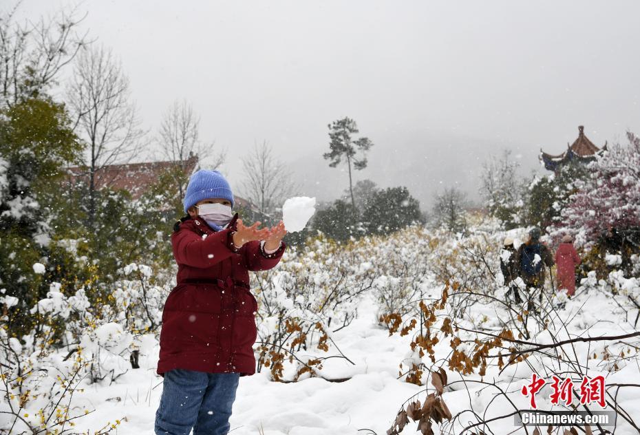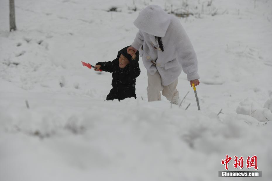 2月7日,安徽省合肥市迎来降雪天气,城市披上一层银装,白茫茫一片。在大蜀山脚下“雪打腊梅”的美景,吸引了众多市民前来欣赏拍摄。 图为小朋友在嬉雪。 韩苏原 摄