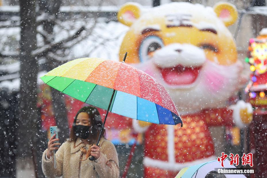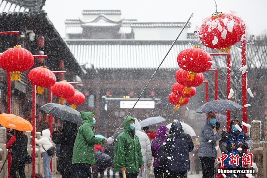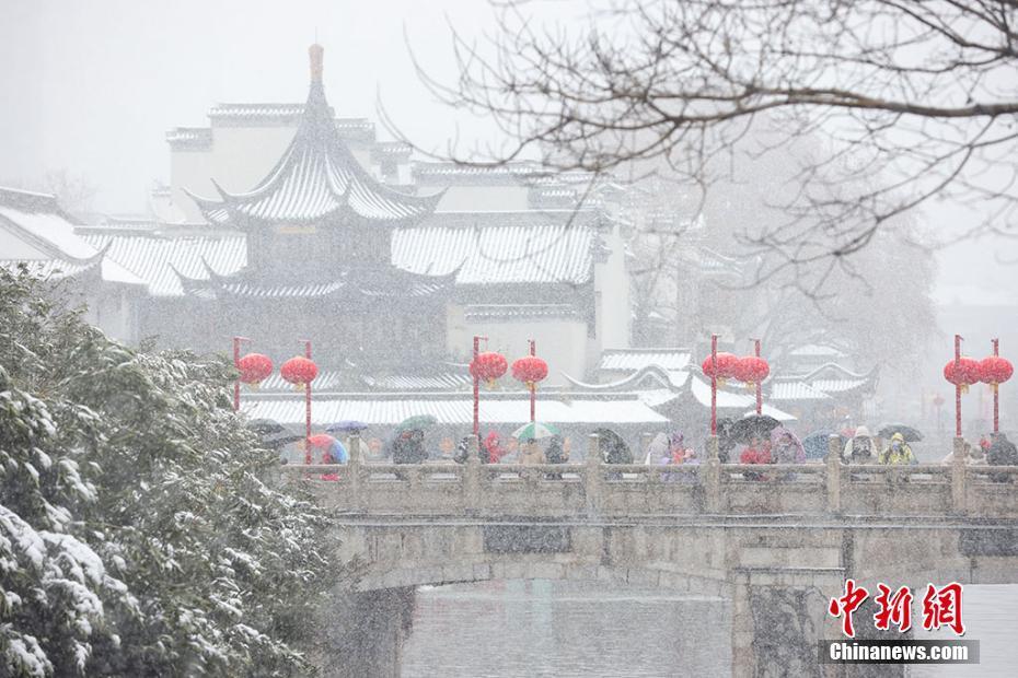 2月7日,南京城迎来漫天大雪,雪花纷纷扬扬。据中央气象台发布的暴雪预警信息预计,安徽东南部、江苏西南部、浙江西北部等地部分地区有大雪。图为市民在雪中参观南京夫子庙。 泱波 摄