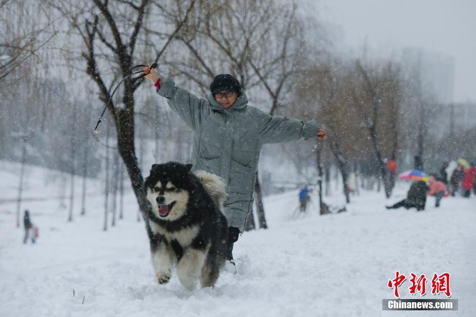 2月7日,大雪中的安徽合肥,民众尽情享受玩雪的乐趣。当日,安徽省合肥市迎来强降雪天气,虽然降雪给市民出行和生活带来不便,但丝毫没有影响人们玩雪的兴致,市民纷纷走出户外,尽情享受这美丽的白雪世界。图为市民带宠物在雪中嬉戏。 张娅子 摄