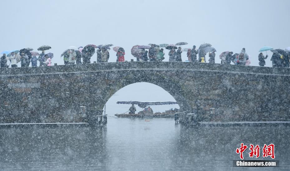 2月7日,众多游人撑伞在西湖断桥上赏雪。当日,浙江杭州出现降雪天气,雪中的西湖美景吸引游人。 中新社记者 王刚 摄