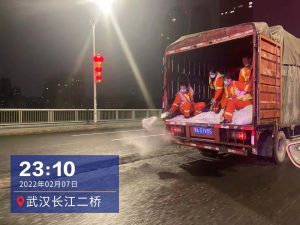 23时许,在武汉长江二桥,施工车辆正对桥面进行撒盐除冰作业,市交管局二桥大队副大队长李辉介绍,为防止行人滑倒,桥面双向人行道积雪已被扫除,他不忘提醒作业人员注意车道边沿及匝道等易结冰区域,做到除冰无死角。