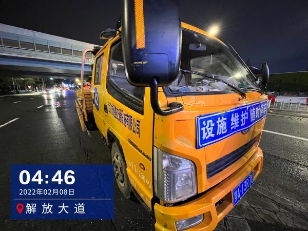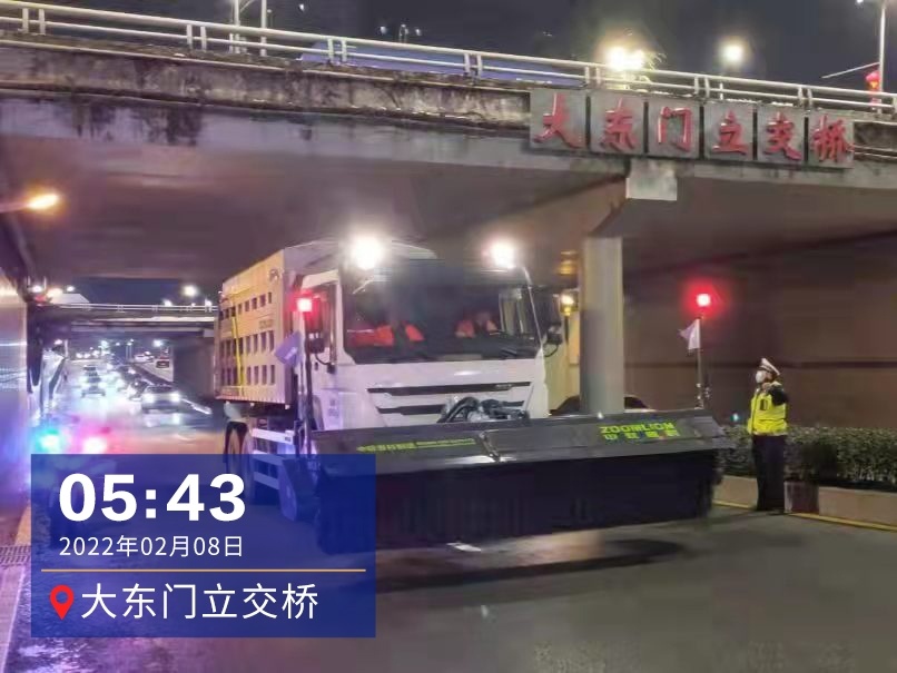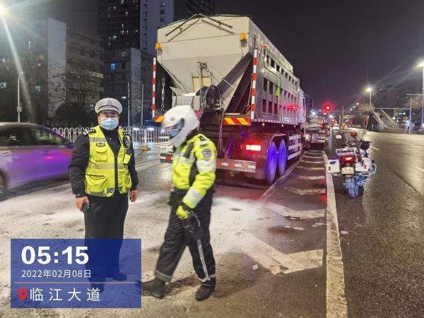 凌晨1时许,市交管局高管大队一中队副中队长李俊华和4名战友,在机场二通道及四环线巡逻管控,交警联系养护部门,出动铲雪车和撒盐车,将双向应急车道积雪及时清除,消除安全隐患。