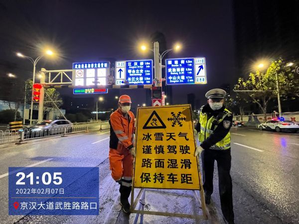 21时许,在京汉大道武胜路路口,硚口区交通大队一中队副中队长曹勇正在武胜路高架旁疏导交通,他引导来往车辆有序通行,同时协助设施维护人员,架设“冰雪天气谨慎驾驶”提示牌。