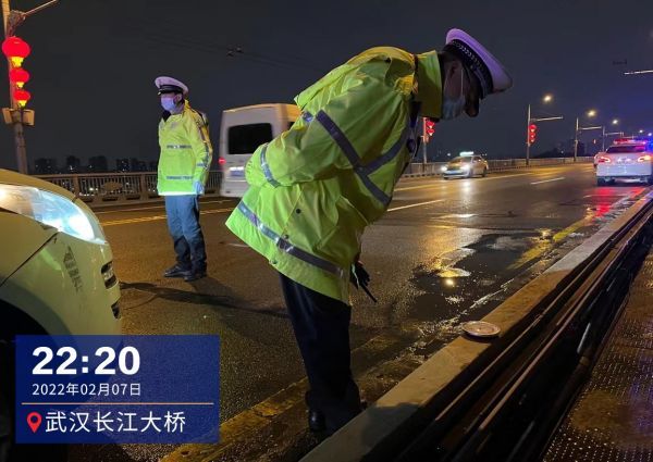 22时许,武汉长江大桥寒风刺骨,市交管局大桥大队事故中队中队长金智勇驾驶警车来到桥梁中部,携带测温仪下车查看室外温度和结冰情况,“今晚注定是个不眠夜。”每小时巡查一次,每次巡查至少半个小时,在桥面工作二三十年,这位经验丰富的交警早已习惯。