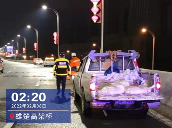 凌晨2时许,交警巡逻至雄楚高架时发现环卫工人正清理路边两侧少量积雪,“你们辛苦了!”孙警官拿起铁锹和师傅们一同忙活起来。
