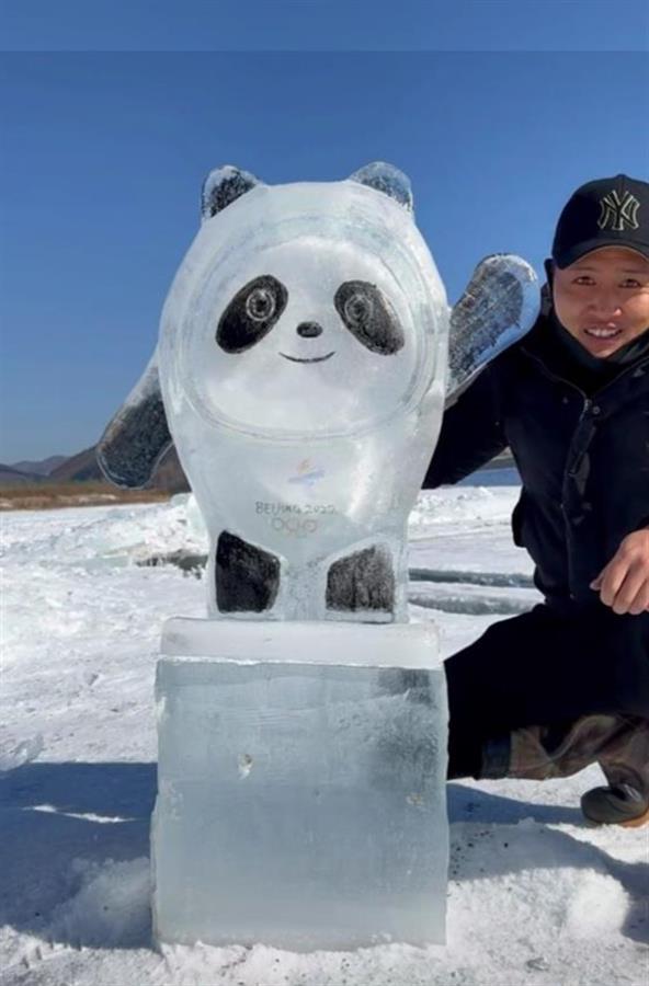 网络视频显示,在满是冰雪的地面上,一名戴着帽子身穿羽绒服的男子,正在使用真冰制作冰雕。等制作完成,一尊惟妙惟肖的北京冬季奥运会吉祥物“冰墩墩”跃然纸上。