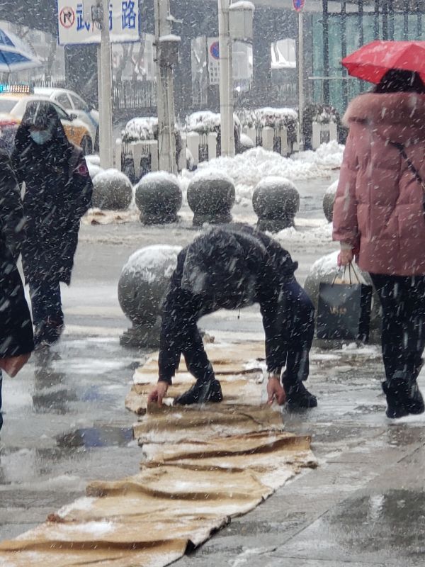 武商MALL·世贸工作人员雪中铺设防滑垫。