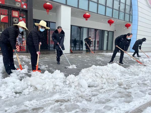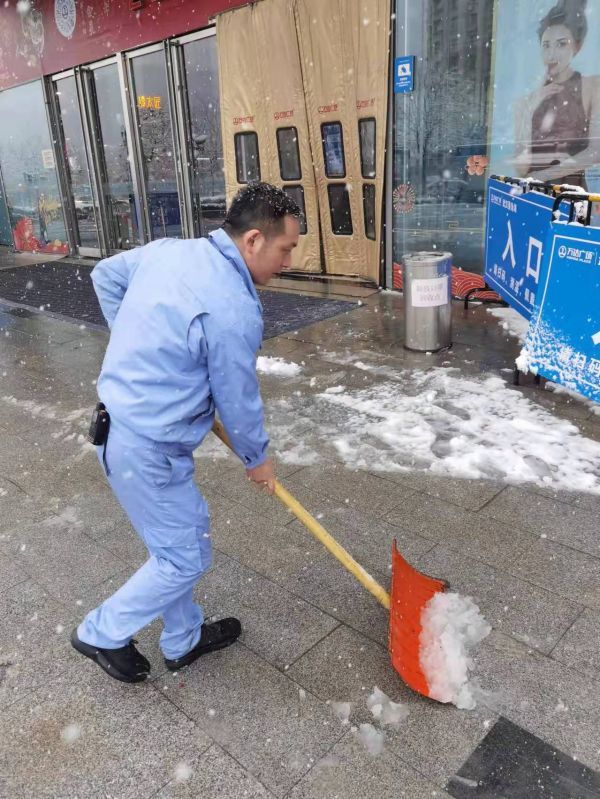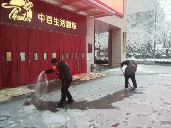 中百仓储、中百生活剧场门前,工作人员随时进行除雪工作。