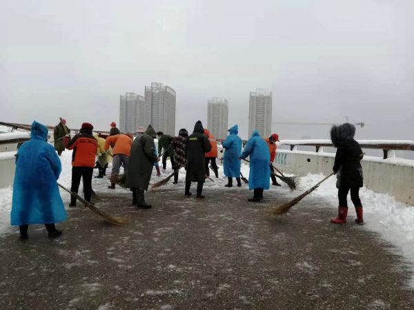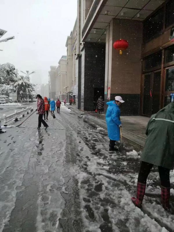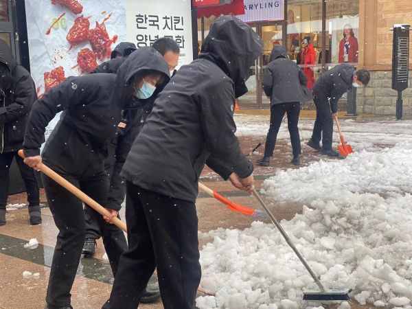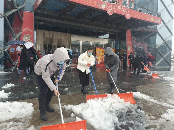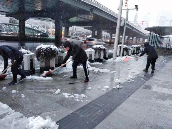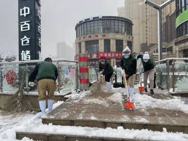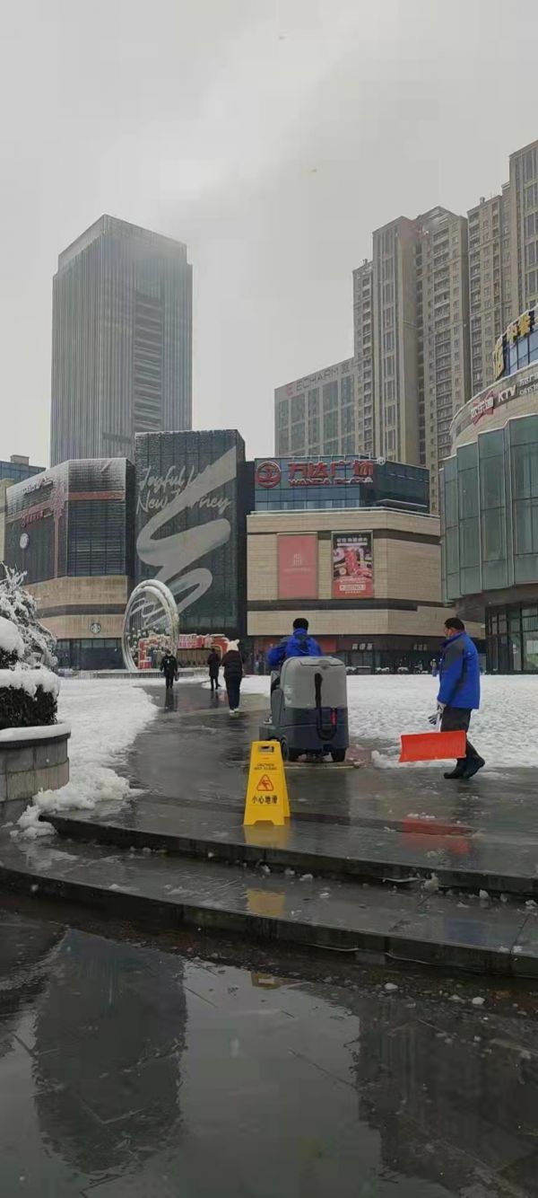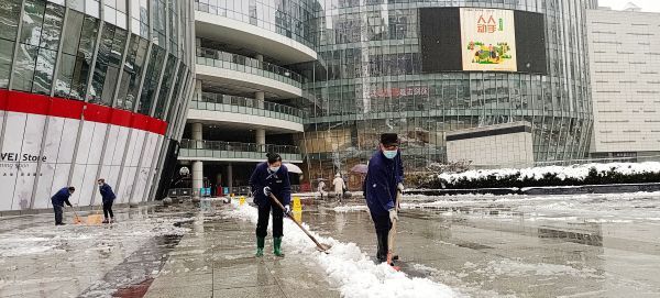 以大型购物中心为主的汉阳与经开商圈内,同样进行了积极除雪的保障工作,工作人员集中上岗除雪,保障市民出行安全。