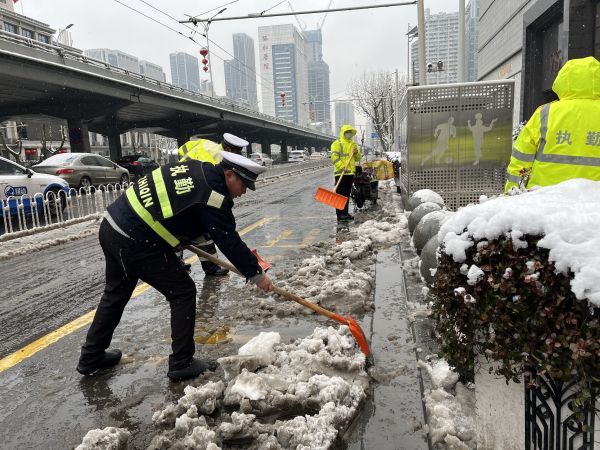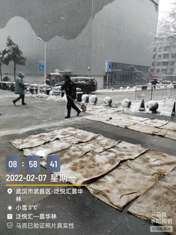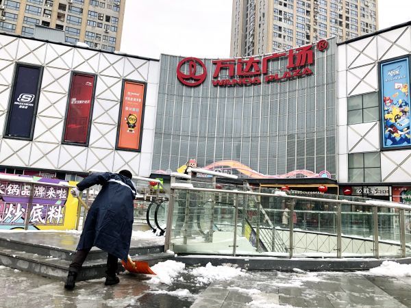汉阳万达广场主要通行路口已无明显积雪,工作人员持续除雪。