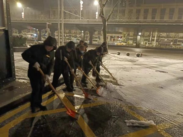 武商MALL·武广门前车辆接驳口正在进行动态除雪。