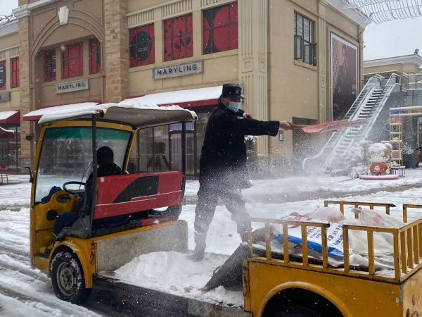 武汉百联奥特莱斯内电瓶车辆装载融雪盐,进行大面积除雪工作。