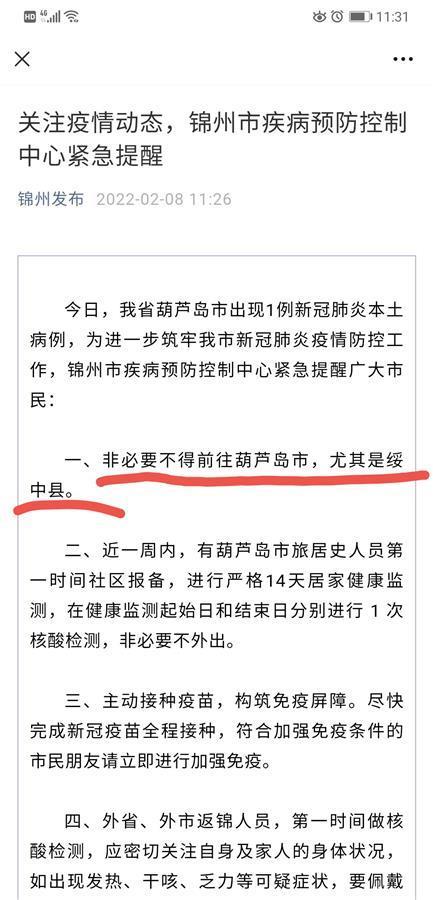 辽宁省锦州市疾病预防控制中心发布紧急提醒,非必要不得前往葫芦岛市,尤其是绥中县。近一周内,有葫芦岛市旅居史的人员第一时间社区报备,进行严格的14天居家健康监测,在健康监测起始日和结束日分别进行1次核酸检测,非必要不外出。