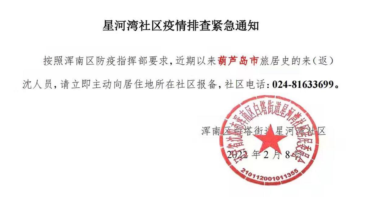 沈阳市浑南区白塔街星河湾社区居委会在辖区发布的紧急通知中称,近期以来有旅居葫芦岛的来返沈阳人员,请立即主动向居住地所在社区报备。
