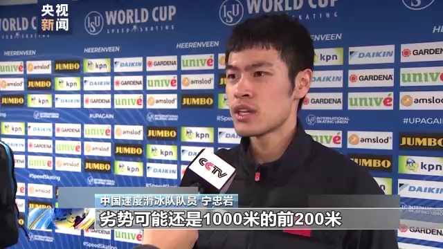 中国速度滑冰队队员 宁忠岩:优势上可能还是中后程比较好吧,劣势可能还是1000米的前200米,可能还会落点速度,还是有点慢。起跑方面不是特别好,继续加强弯道技术,因为弯道很出速度。