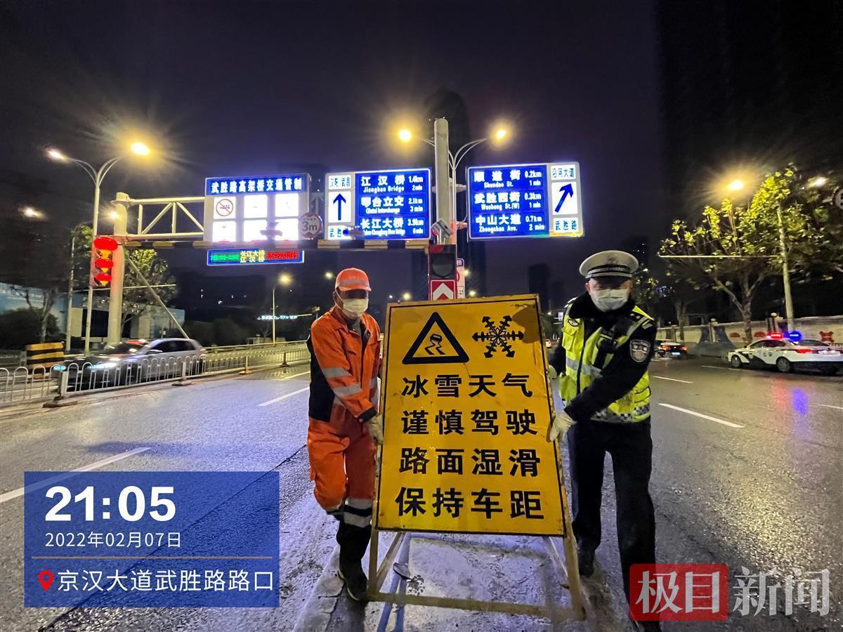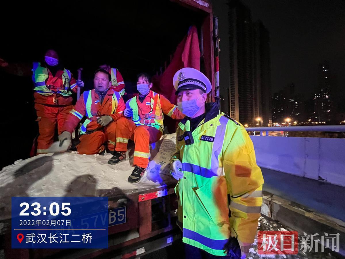 原来,在过去的这个夜晚,武汉交警在通宵巡查,配合有关部门除雪融冰。