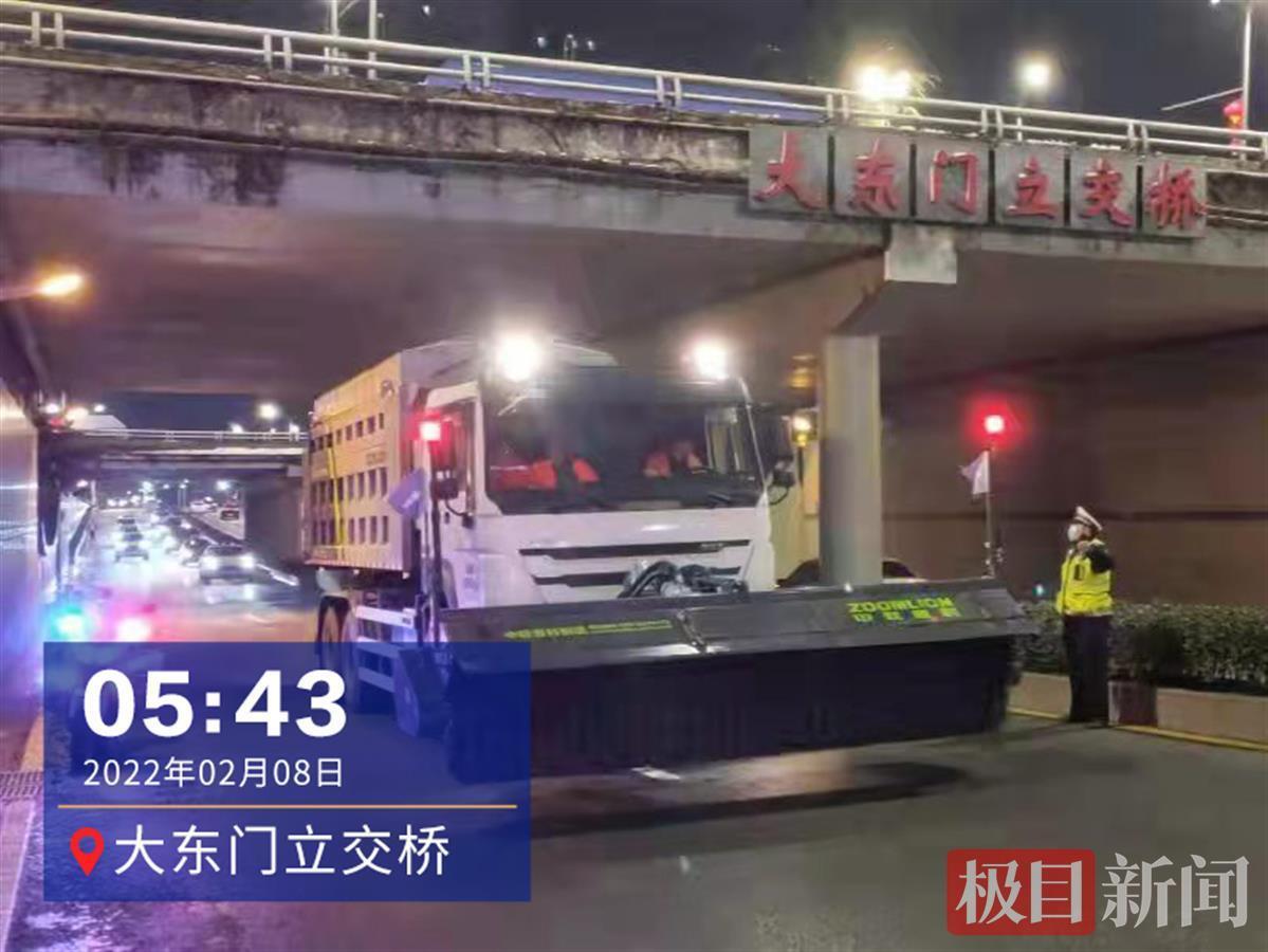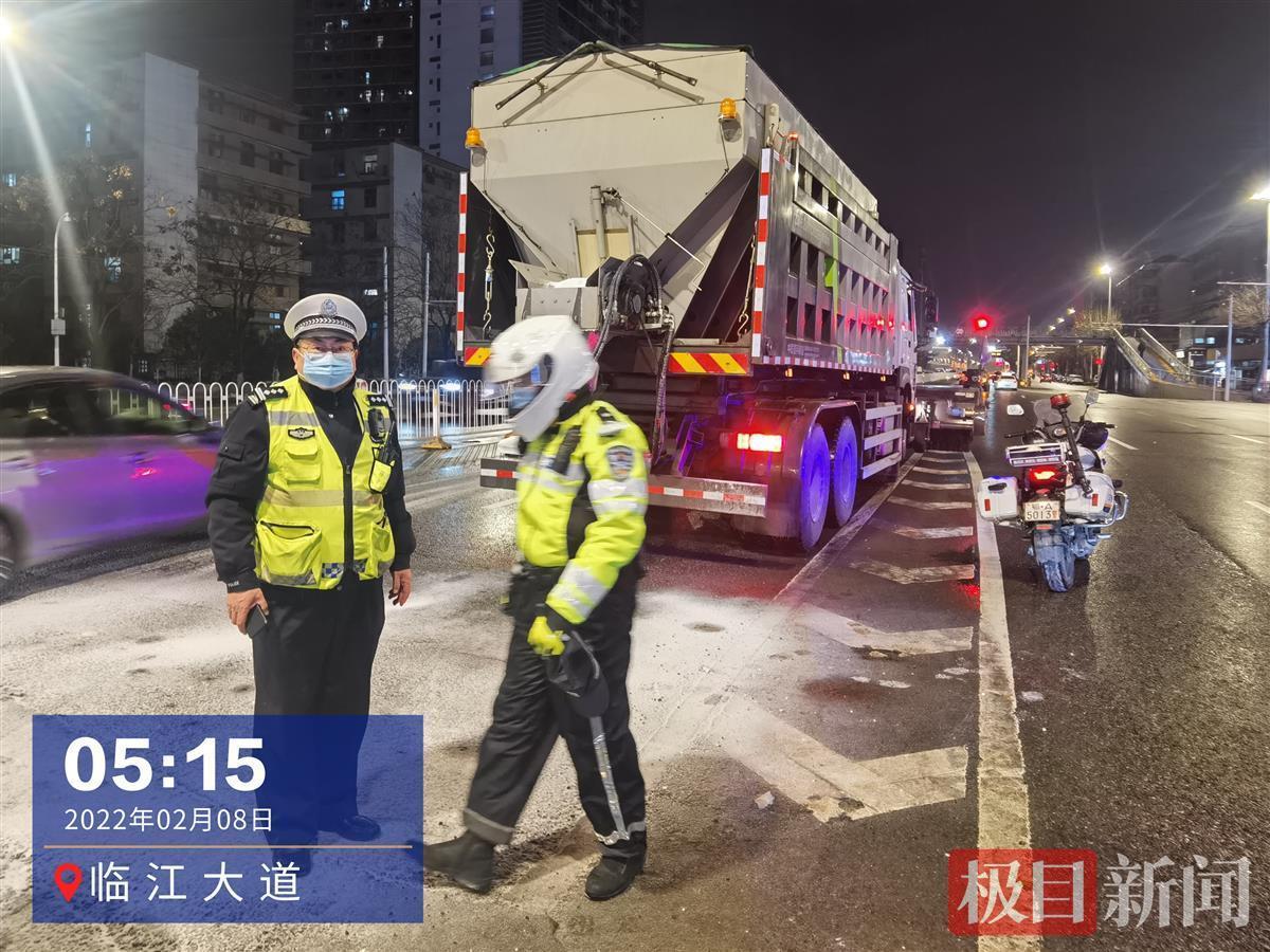 8日凌晨2时20分许,交警巡逻至雄楚大街高架,发现环卫工人正清理路边两侧少量积雪,“你们辛苦了!”孙警官拿起铁锹和师傅们一同忙起来。