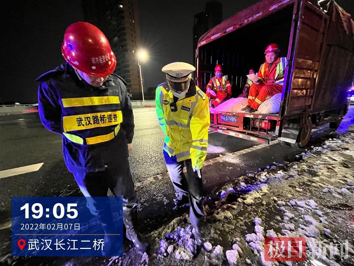 7日晚11时许,在武汉长江二桥,施工车辆正对桥面进行撒盐除冰作业,市交管局二桥大队副大队长李辉介绍,为防止行人滑倒,桥面双向人行道积雪已被扫除,他不忘提醒作业人员注意车道边沿及匝道等易结冰区域,做到除冰无死角。