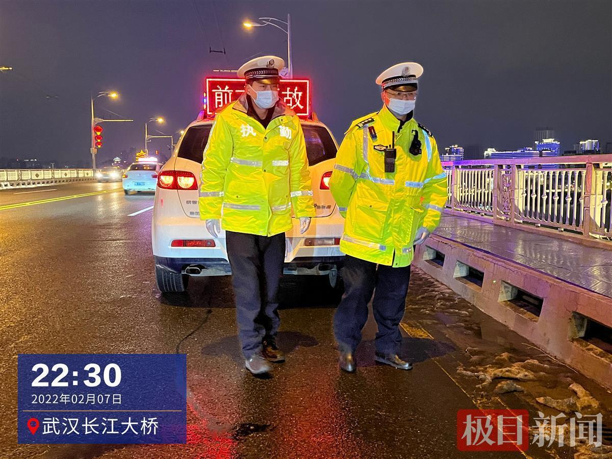 7日晚10时30分许,武汉长江大桥寒风刺骨,市交管局大桥大队事故中队中队长金智勇驾驶警车来到桥梁中部,携带测温仪下车查看室外温度和结冰情况,“今晚注定是个不眠夜。”每小时巡查一次,每次巡查至少半个小时,在桥面工作二三十年,这位经验丰富的交警早已习惯迎接挑战。