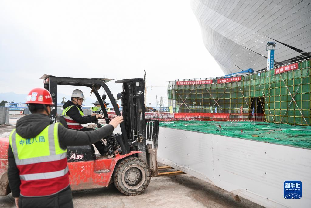 2月7日,施工人员在重庆龙兴足球场项目建设现场作业。