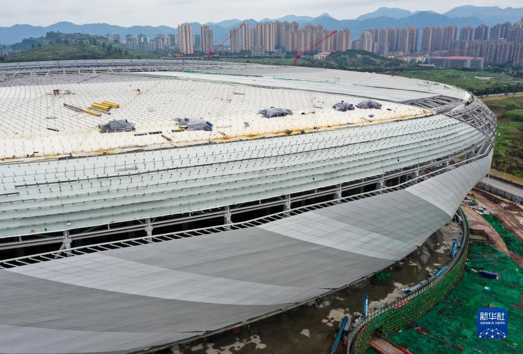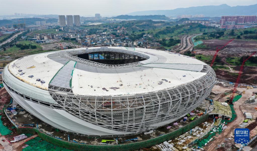 2月7日拍摄的重庆龙兴足球场项目建设现场(无人机照片)。