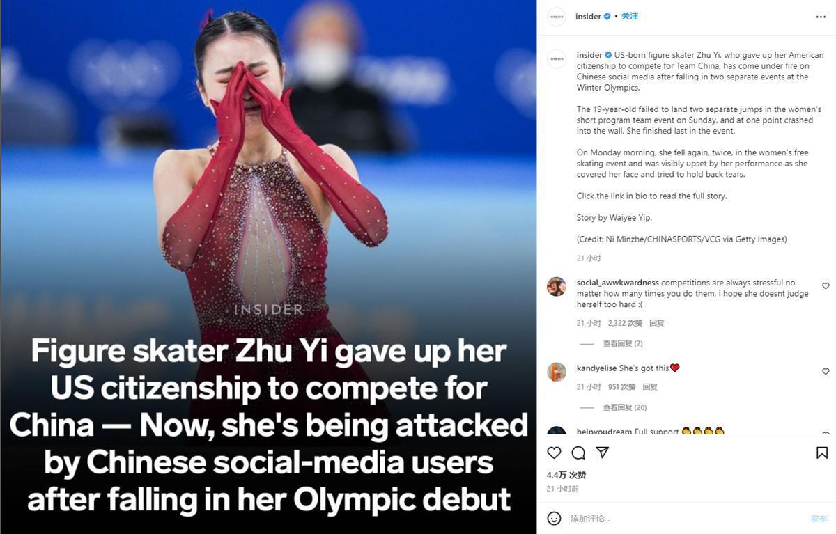 2月7日,美国媒体“Insider”在社交媒体Instagram上发布了一张中国花样滑冰女运动员朱易的照片,嘲讽她在比赛摔倒两次,遭到中国运动员谷爱凌的回击。