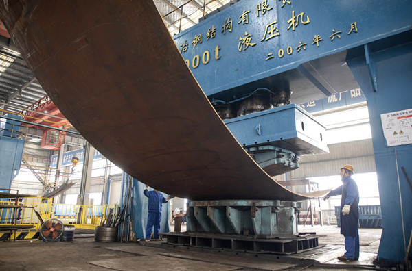 液压机压制球壳板。 通讯员汪学超 摄