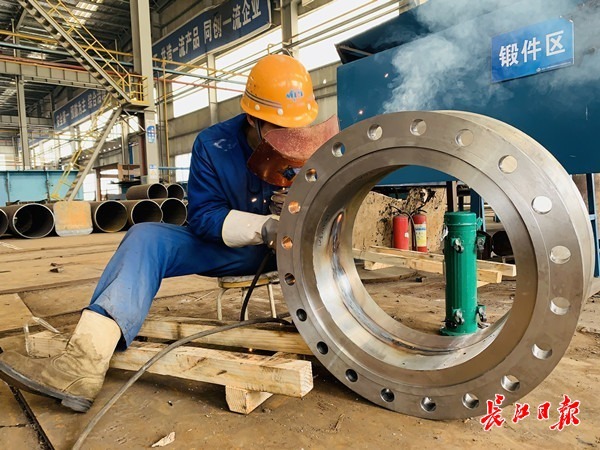 一冶科工的工人在组装焊接厚壁管和法兰。 记者陶常宁 摄