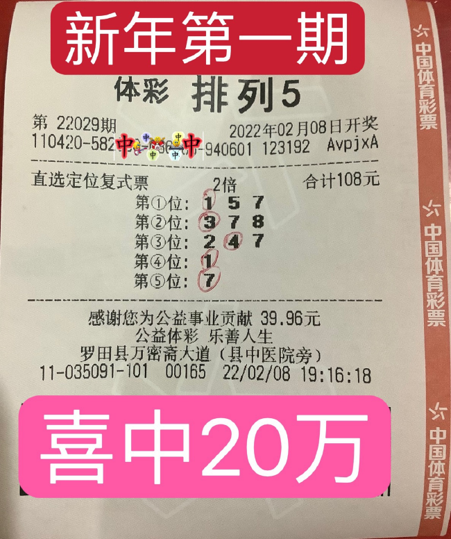 2月8日,体彩开市首日,黄冈罗田县一位资深购彩者采用直选定位复式2倍的方式,中得虎年首期排列5大奖20万元。