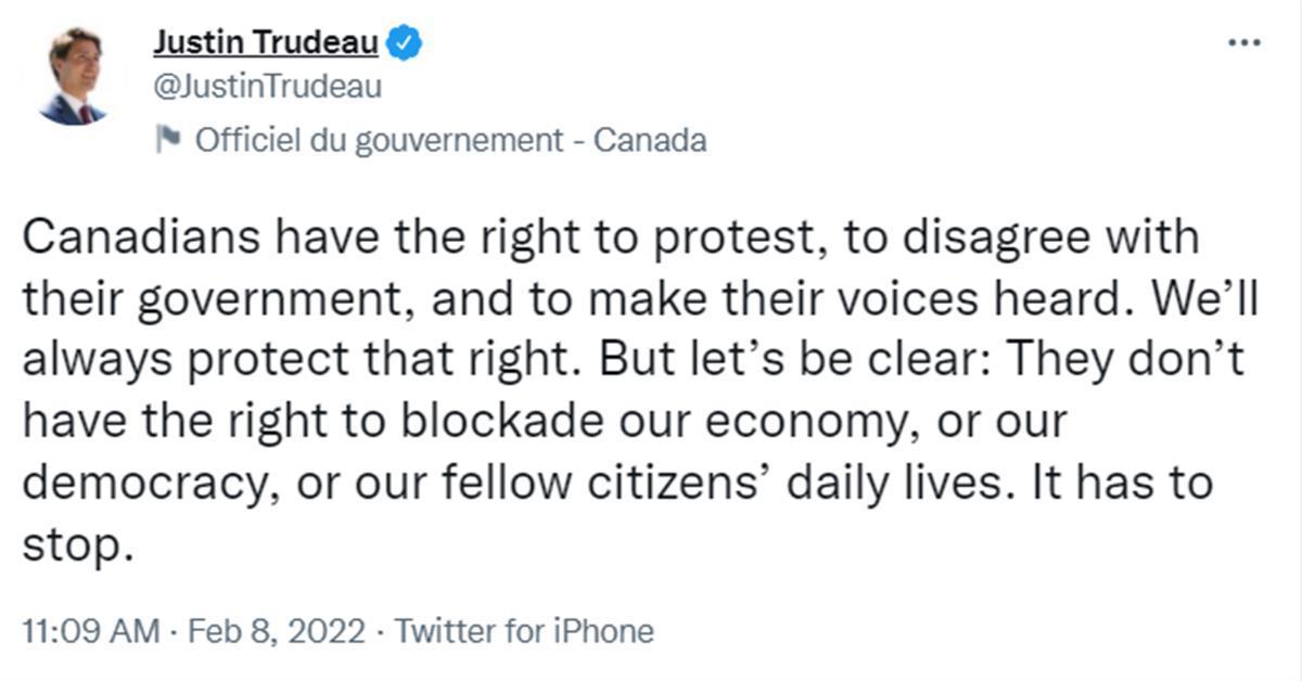 “加拿大人有抗议的权利,但有一点要明确的是,他们无权干扰经济、民主以及人们的日常生活。”特鲁多在推文中表示。