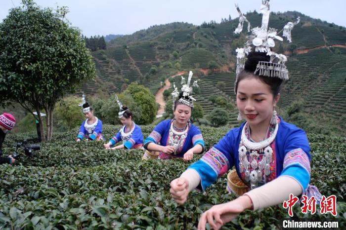 “千座茶山苍翠欲滴,万亩茶园美如画卷”。2月10日,广西柳州市三江侗族自治县早春茶开采仪式在该县马湾·茶园里举行。十几名身穿传统侗族服饰的采茶少女手指上下翻飞,熟练地将鲜芽摘取放入竹篓中。这样一片片碧绿如染、接连如山的茶园,如今已成为这座人口仅有30余万的小县城的招牌名片。