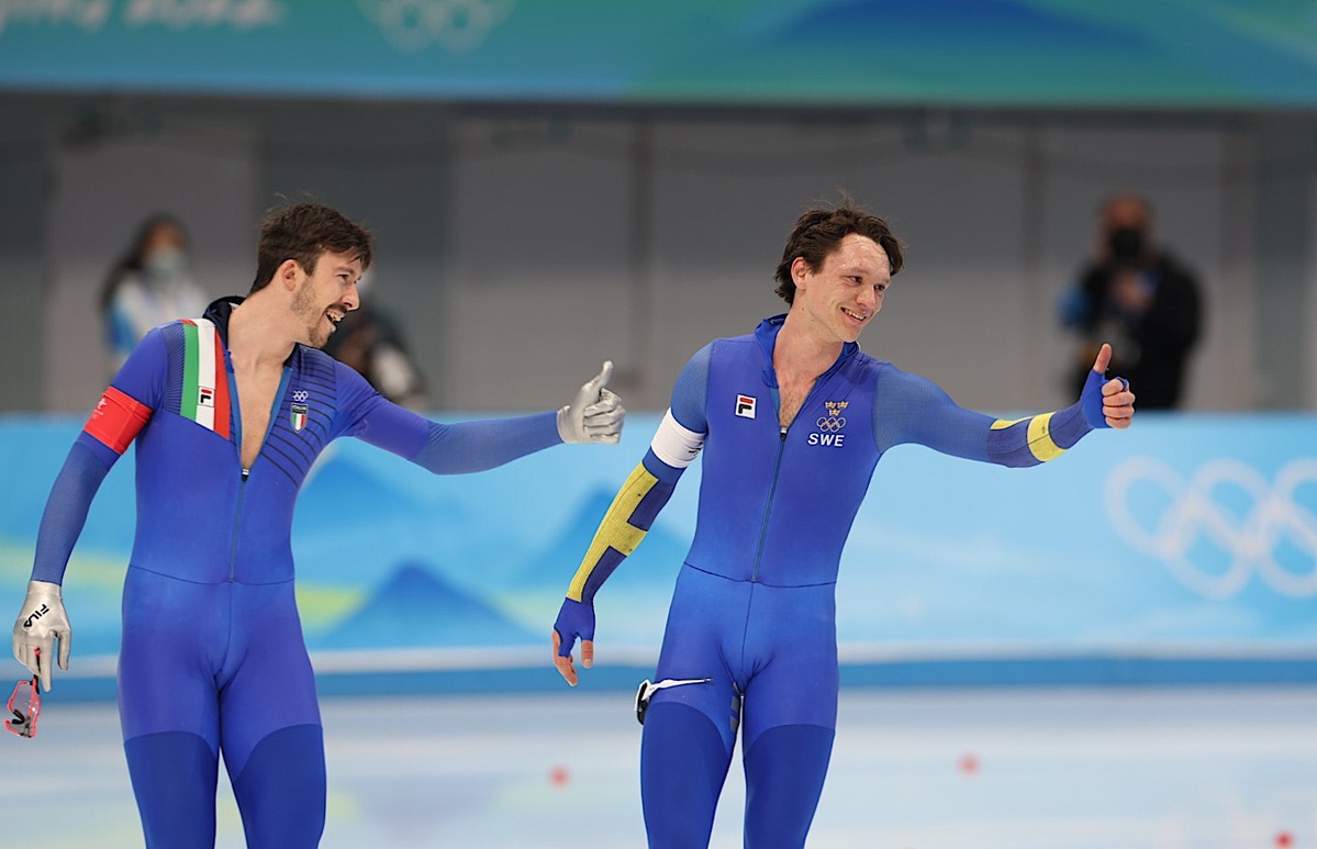 2月11日,瑞典选手尼尔斯·范德普尔(右)在比赛后庆祝。中国日报记者 冯永斌 摄
