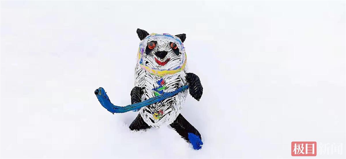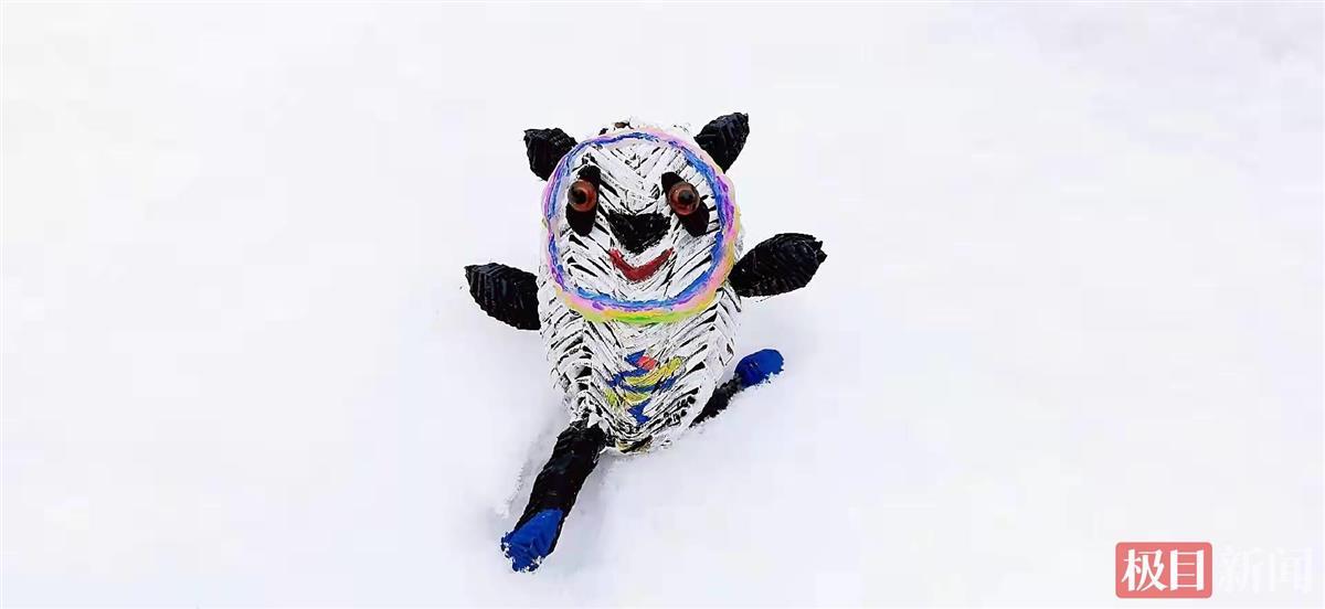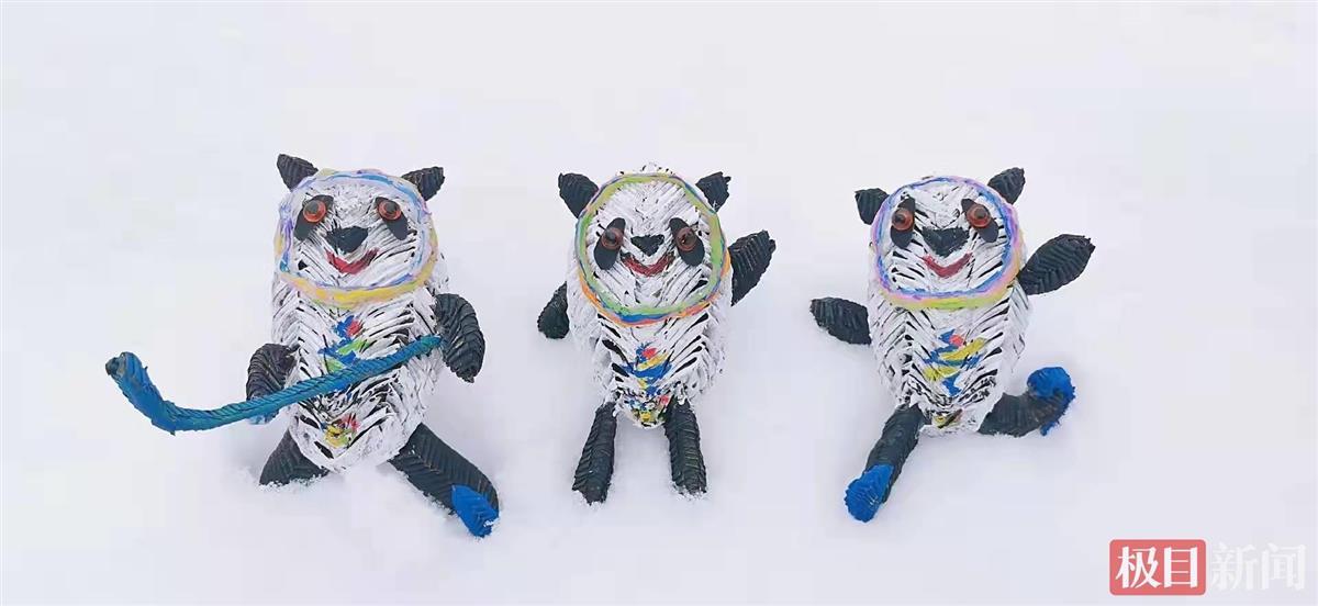 滑雪的、玩冰壶的、还有一个正在做欢迎手势的……通过余木兵上传的视频,极目新闻记者看到,他一共给孙女做了三款形态各异的冰墩墩。余木兵说,三款冰墩墩都是他参照网络上的图片做出来的,“先用铁丝做骨架,再用棕树叶做身体,最后用油漆上色,做好一个冰墩墩需要五个小时。”