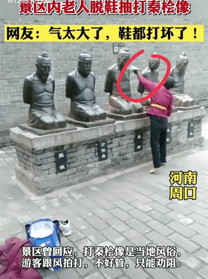 游客脱鞋抽打秦桧雕塑也并非头一遭,此前有报道显示,有游客用鞋底抽打秦桧雕塑,抽打完还对着镜头比耶。有老人也曾用鞋抽打,被网友调侃“气太大了,鞋都抽坏了”。这些行为景区都曾予以制止,不过同时表示打秦桧是当地风俗,不好管,只能劝阻。