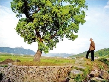 2008年,韩老在家乡父亲生前栽的香樟树前。