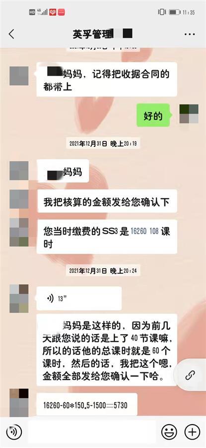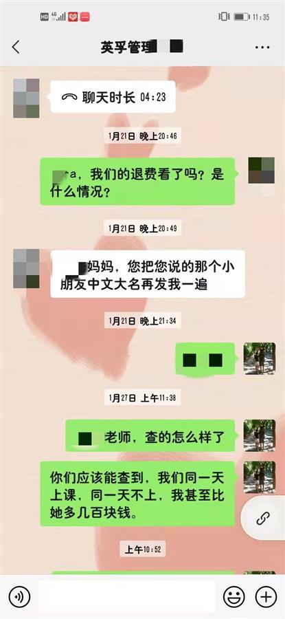 据介绍,李先生给自己的孩子缴纳了7500多元的培训费用。孩子除了上过三次体验课,一节正式的课程都没有上。他告诉极目新闻记者,“我一节正式的课都没有上,怎么退费的时候就这么难?”从去年12月至今,期间至少有两次,李先生都跟对方进行了沟通确认,对方均表示2月10日会退费。到了承诺的退费时间,李先生发现自己的账户并没有收到任何退费。李先生说:“当时太晚了,我只能在网上与班主任万若思进行沟通,她解释说公司财务人员因为刚刚复工,退款要等到2月19日。难道我不问,她就一直不打算告诉我吗?”