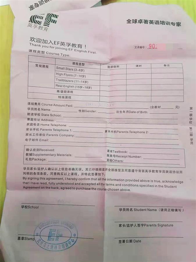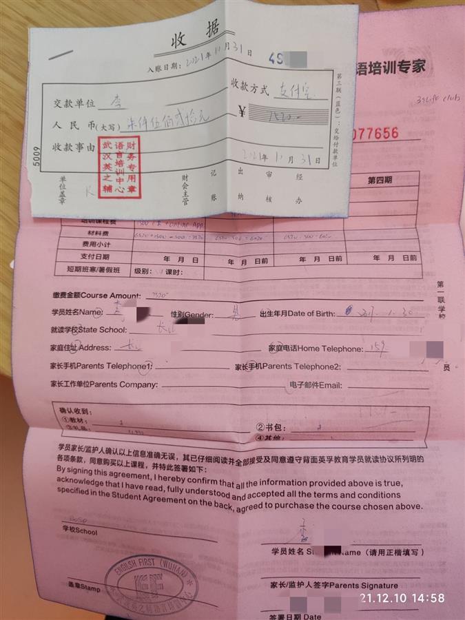 2019年,杨女士在英孚教育经开永旺店给孩子缴费16300元,报名了少儿英语培训学习。“当时孩子还没上小学,现在都已经上一年级了,但是,已缴纳的费用还没有退下来。”杨女士告诉极目新闻记者:“这16300元的课程费,大概只上了一半,期间班主任换了三次了。”后来,杨女士又在该机构缴纳了15960元。她解释说,“因为期间不断有工作人员表示有活动有优惠,自己就报名缴费了,但因为经常换老师,现在孩子也不想去了。”