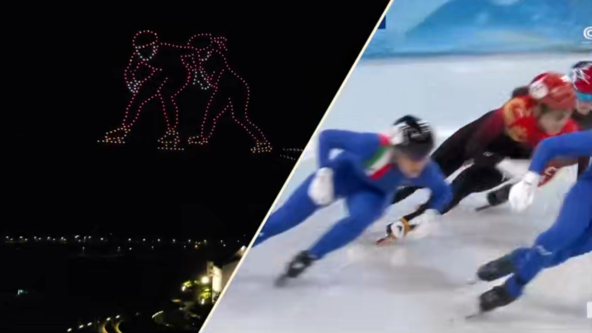 此外,团队也融入了一些他们的 “小心思”。为了能淋漓尽致地体现运动员为国争光的精彩瞬间,飞行画面采用了动态设计。“单板滑雪男子坡面障碍技巧决赛中,苏翊鸣摘得银牌,创新历史纪录,我们也选用了他在比赛中较为标志性的往前滑的动作,以及我们选取了短道速滑混合团体2000米接力决赛中两个人接力那一刻的动作,如果观察到细节可以发现,是一男一女往前推。这些画面都是动态呈现的。”