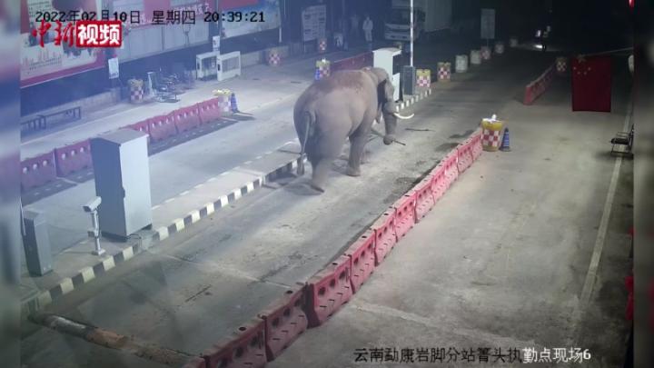 无独有偶,另一头成年大象也在同一天来到岩脚分站执勤现场,在监控下大摇大摆地走进了边检站,分站执勤民警迅速疏散过往旅客和周边群众,并用手电指引,将大象引出执勤现场。