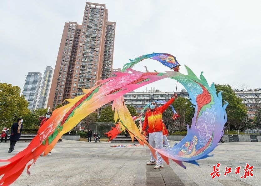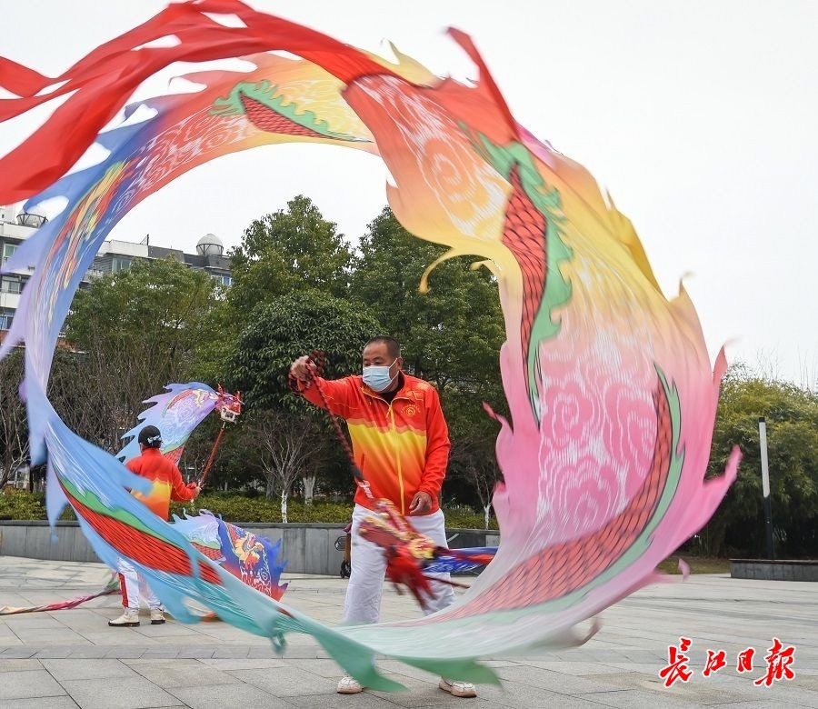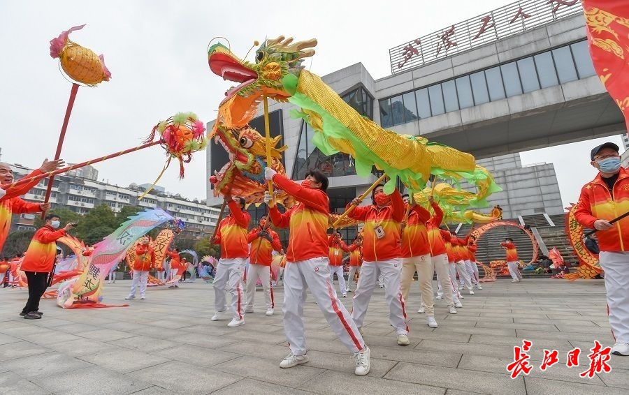 2月14日,武汉工人文化宫热闹非凡,江汉健身舞龙协会的成员表演的精彩舞龙,吸引了不少市民驻足观看。