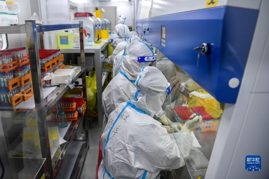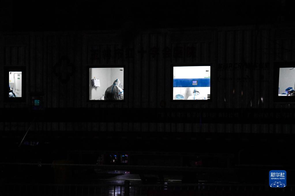2月13日夜,检测人员在移动核酸检测车内工作。