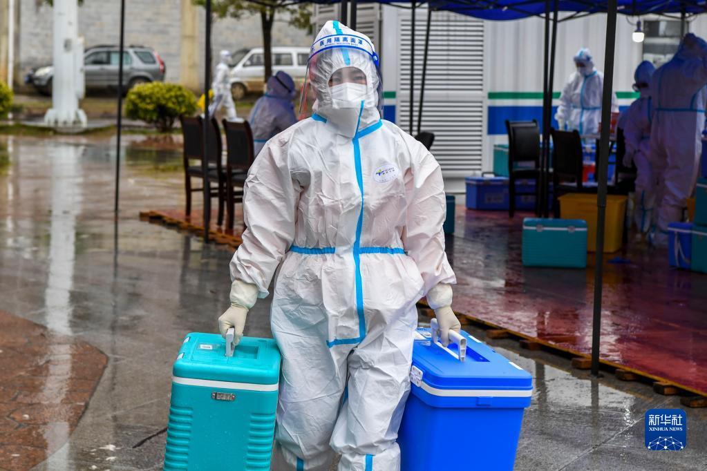 2月13日,工作人员在气膜实验室内转移医疗废弃物。