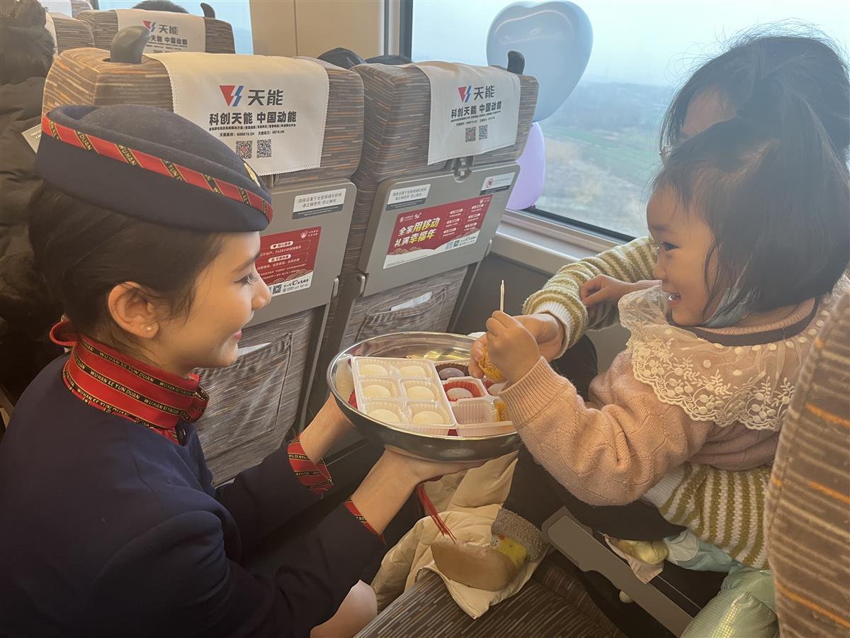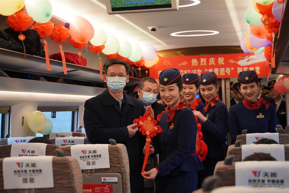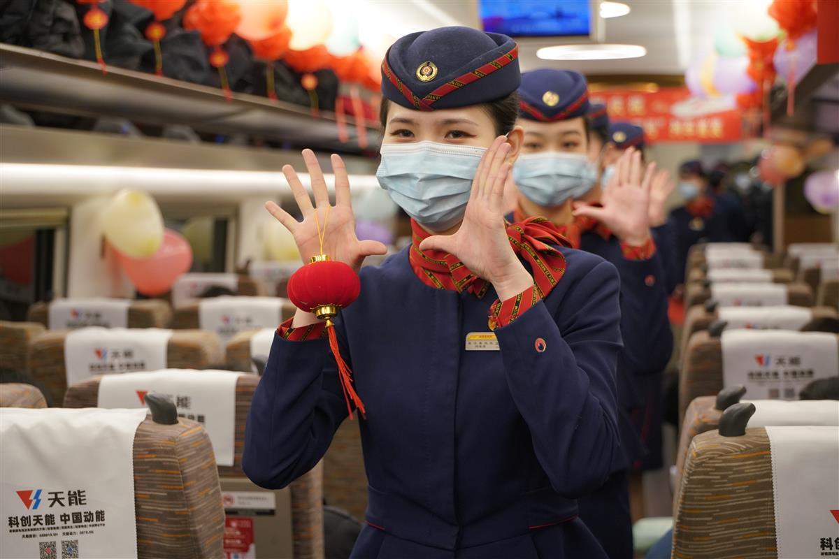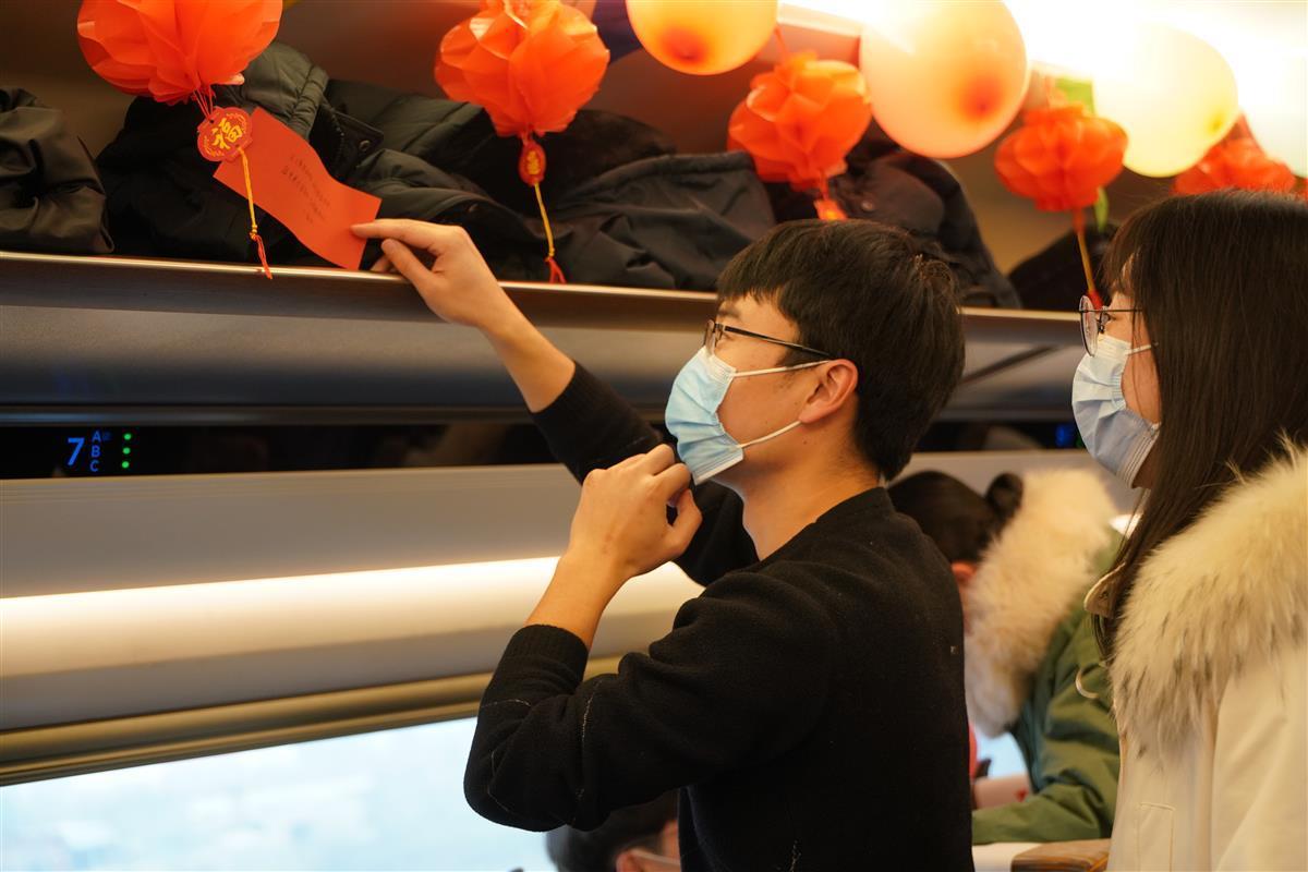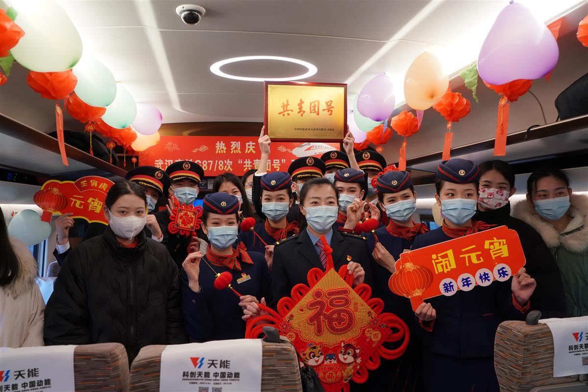 为庆祝首趟“共青团号”客运列车开出、喜迎虎年元宵节的到来,5号车厢内,武汉客运段乘务员载歌载舞,与旅客一起猜字谜、吃汤圆,共享喜悦与幸福。来自武汉的张女士第一次在高铁上欣赏到如此丰富多彩的表演,她开心地说,节目很精彩,氛围很温馨。