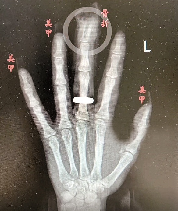 对于江女士的伤情,冯伟分析,江女士甲片长度是正常指甲长度的2倍,又有一定向下的弧度,摔倒的瞬间,受到极大冲击力,同时,手指触地时指甲比手掌更早接触地面,再加上甲片被胶水牢牢固定,这时,“甲片就像个杠杆,直接掀翻指甲,导致指骨骨折。”冯伟说,如果没有美甲,伤害远没有现在严重。
